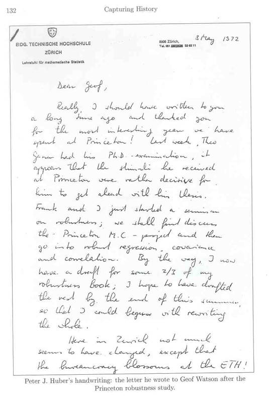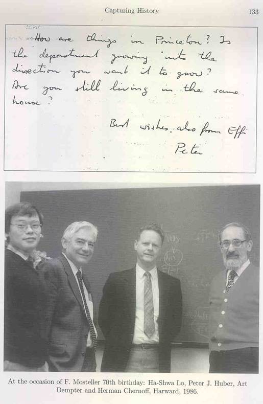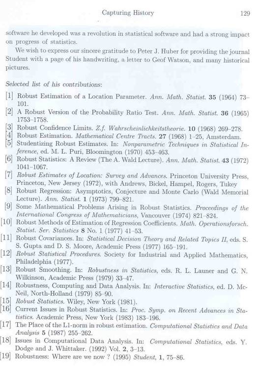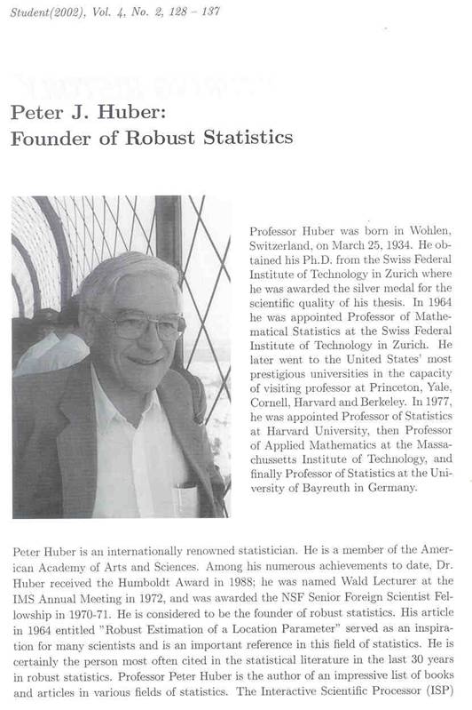 Le Professeur Huber est un statisticien mondialement reconnu. Il est membre de la prestigieuse American Academy of Arts and Sciences, de la Bernouilli Society et de la National Science Fundation aux Etats-Unis dont les membres étrangers sont extrêmement rares. Il est considéré comme le fondateur de la statistique robuste. Le logiciel ISP qu’il a développé fut une révolution dans le domaine informatique et a fortement contribué aux progrès de la statistique. Le Professeur Huber s’avère également être un excellent conseiller et un exemple pour le Groupe de statistique. Ses visites régulières à Neuchâtel témoignent de l’intérêt qu’il porte au Groupe .