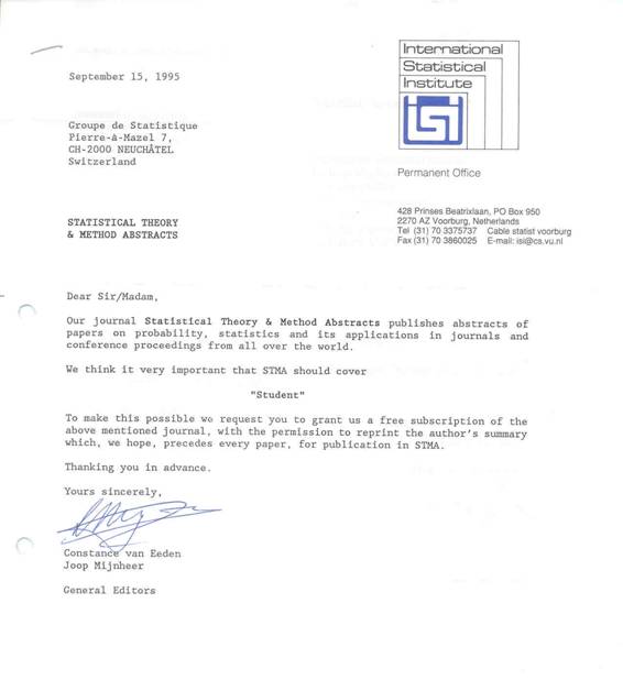 Dans le 3ème numéro de Student, un ensemble d’articles, rédigés par des collaborateurs étrangers, paraîtra sous le nom de Data & Statistics. Ce « journal », incorporé à Student, est le résultat de la collaboration de plusieurs grands statisticiens de renommée internationale, dont les noms figurent dans la liste suivante :